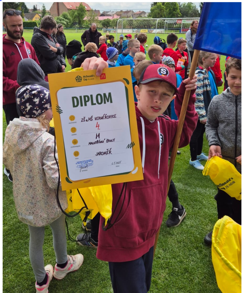 Dne 6.5.2025 se naše ZŠ Vernéřovice, za spolupráce s FK Vernéřovice, zúčastnila 26.ročníku tradičního a prestižního turnaje McDonald´s Cup 2025 na fotbalovém stadionu v Jaroměři. Zde náš školní tým odehrál 3 zápasy, zvítězit se nám sice nepovedlo, ale naši obec a naši ZŠ jsme reprezentovali s maximálním nasazením, maximální slušností, úctou a pokorou. Pro nás všechny to byla výborná zkušenost a možnost porovnání si našich dovedností se soupeři z jiných malotřídek. V turnaji jsme vsítili dvě branky. První branku vsítil Bruno Brúvers za asistence Veroniky Volhejnové, druhou branku vsítil Roman Hromas za asistence Vojtěcha Švece.
